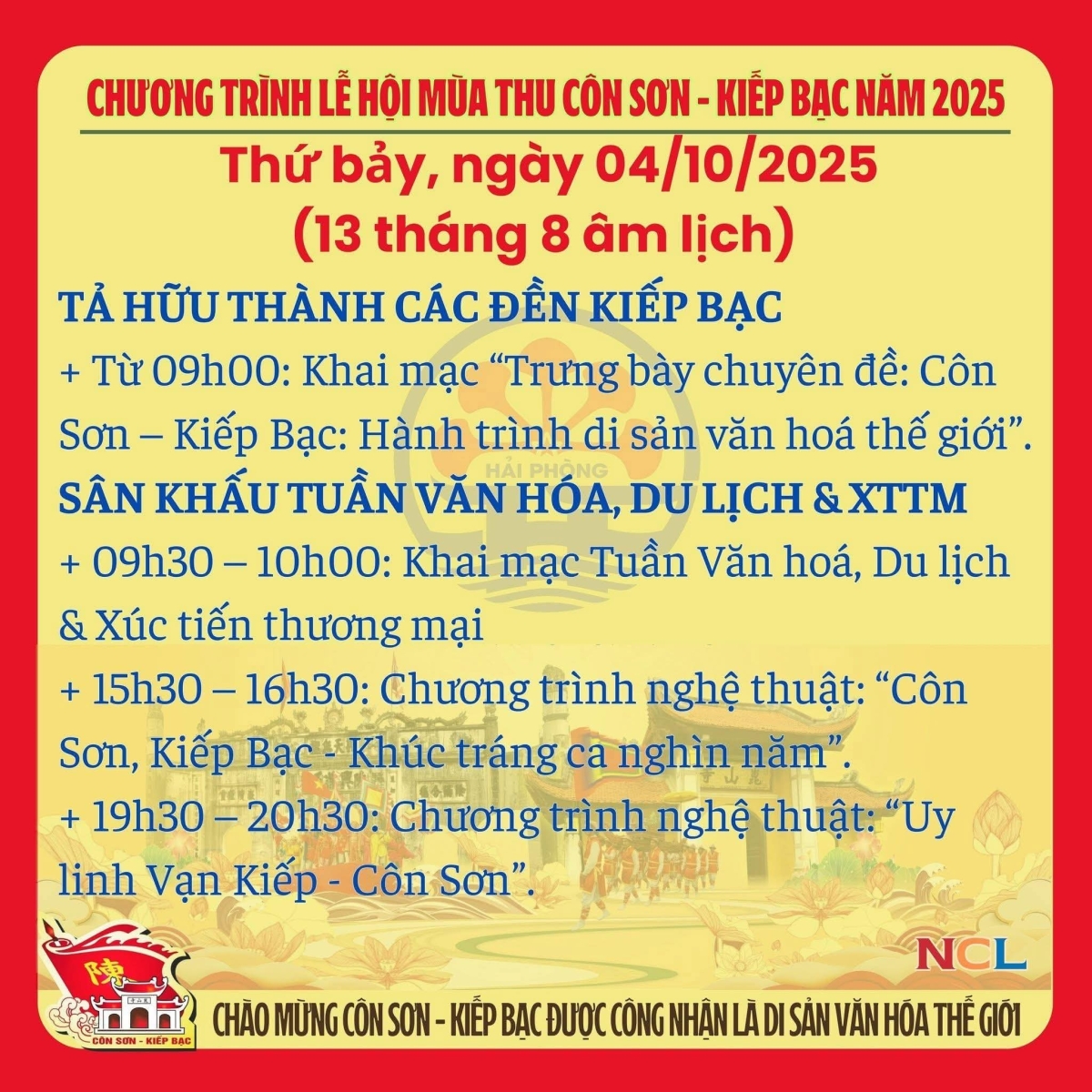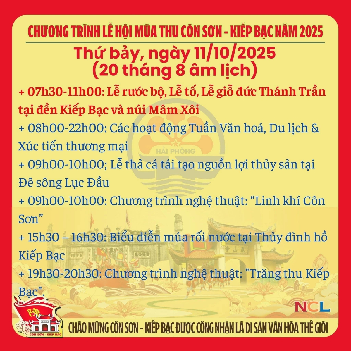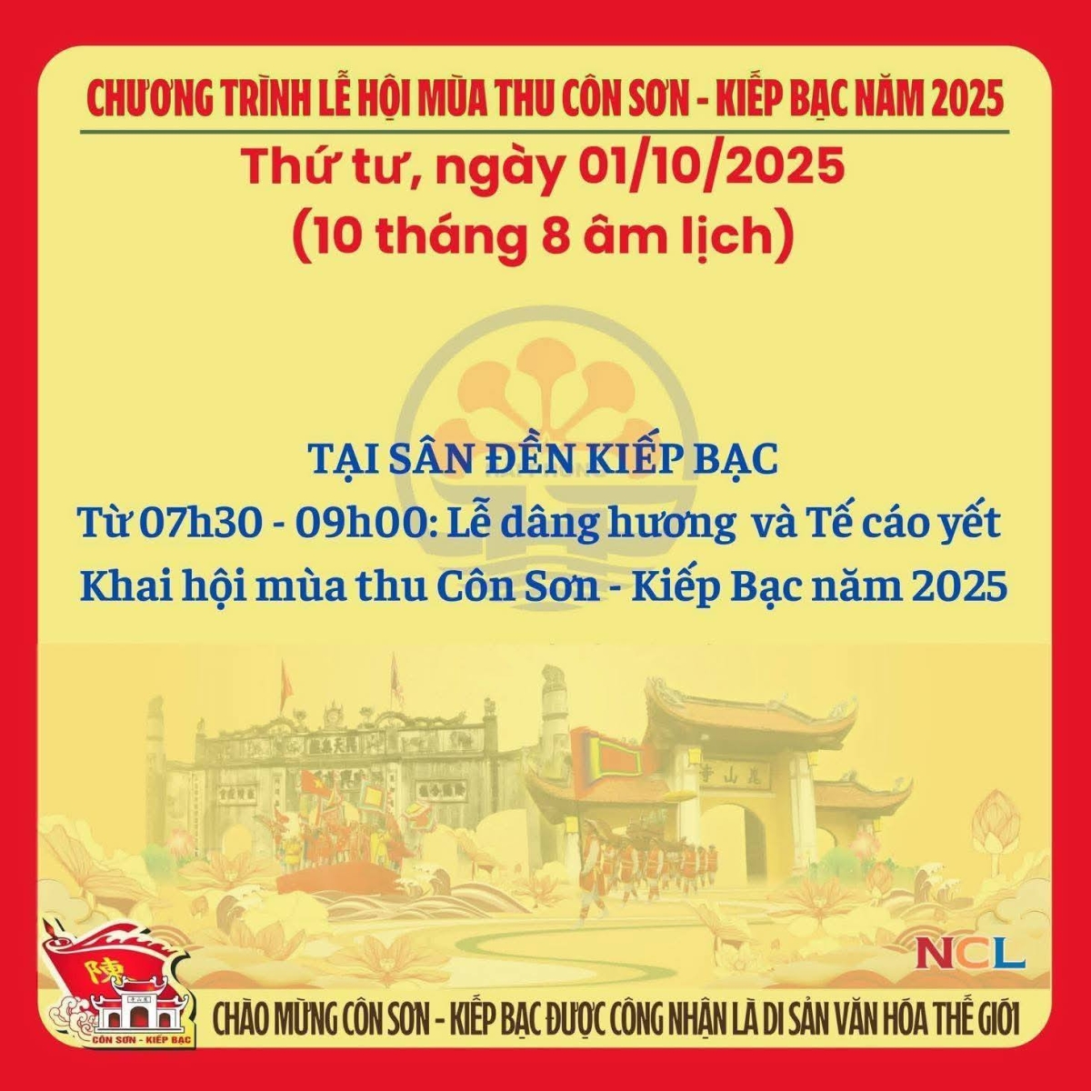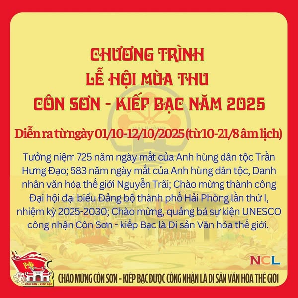 Lễ hội truyền thống mùa Thu Côn Sơn - Kiếp Bạc năm 2025 (Được tổ chức từ ngày 1/10 đến ngày 12/10/2025 tức từ mùng 10/8 đến ngày 21/ 8 âm lịch).