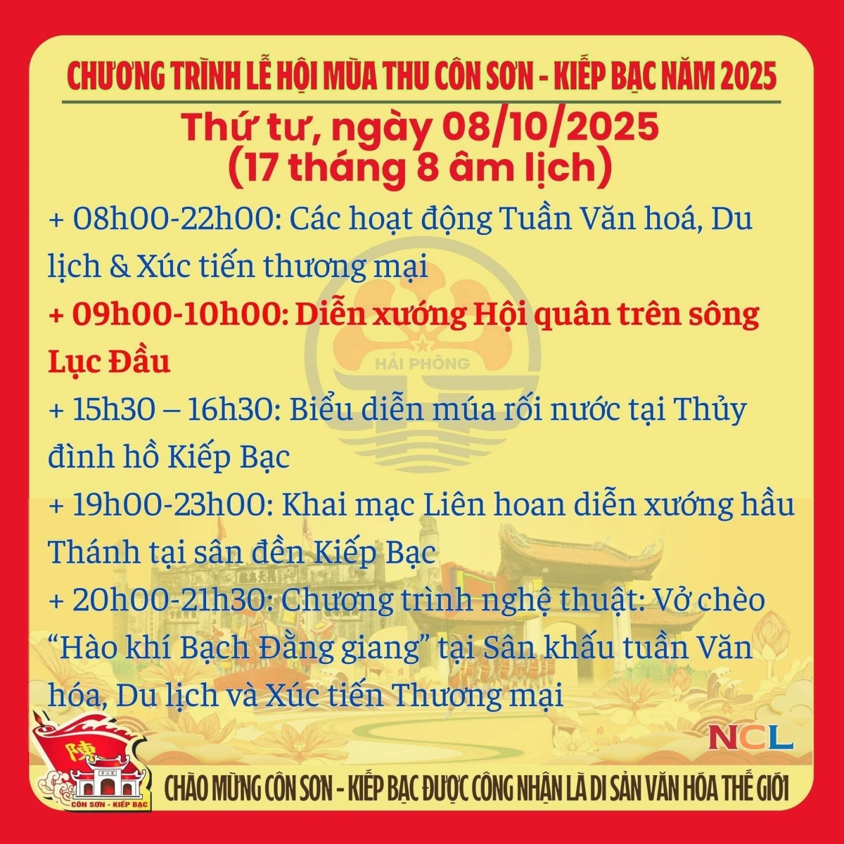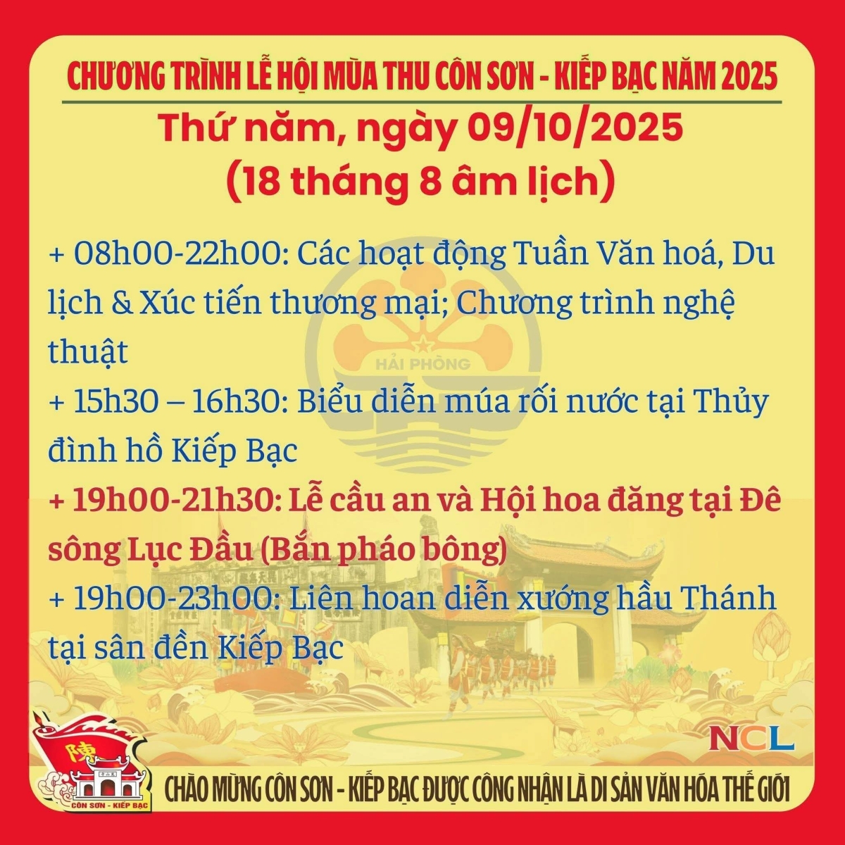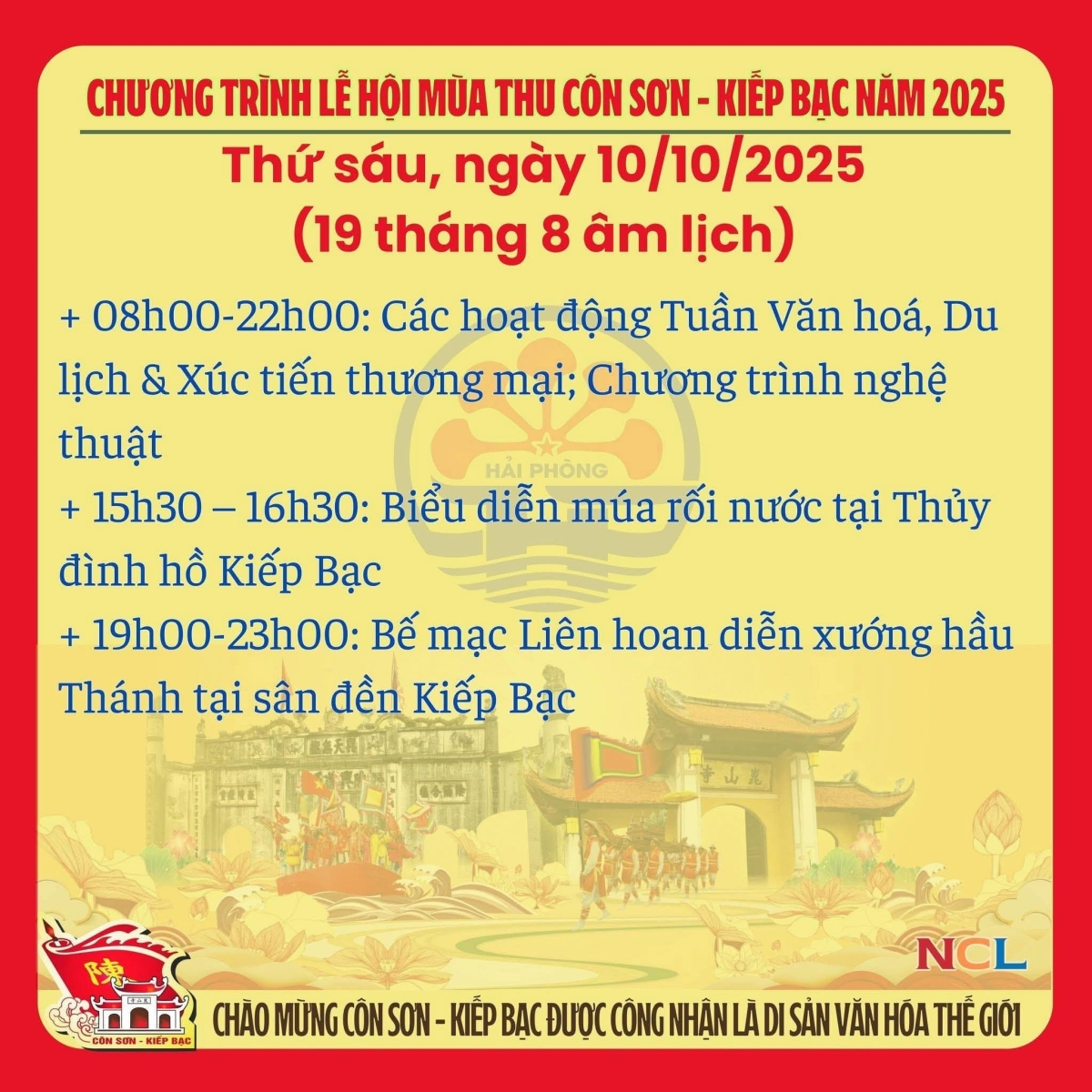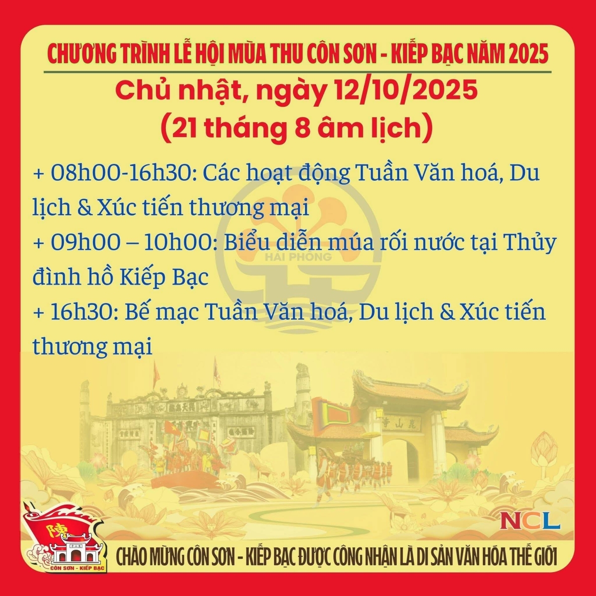 Lễ hội truyền thống mùa Thu Côn Sơn - Kiếp Bạc năm 2025 (Được tổ chức từ ngày 1/10 đến ngày 12/10/2025 tức từ mùng 10/8 đến ngày 21/ 8 âm lịch).