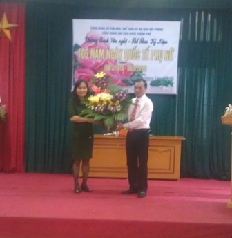 Tiếp theo, ông Vũ Văn Tuấn – Phó giám Đốc Thư viện đã đại diện cho tập thể nam cán bộ Thư viện tặng hoa Bà Phan Thị Thu Hương – Giám đốc Thư viện và toàn thể chị em nữ cán bộ, viên chức Thư viện KHTH Thành Phố; ông Phạm Văn Thi – trưởng phòng Thông tin-tin học, đại diện cho tập thể nam cán bộ tặng hoa bà Chủ tịch Công đoàn Thư viện; Ngoài ra, một Tổ bảo vệ Thư viện cũng có bó hoa tươi thắm gửi tặng chị em Thư viện với lời chúc tốt đẹp.