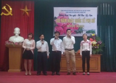 Hội trường thư viện sau đó rộn vang tiếng nhạc, lời ca với những tiết mục hát tập thể, tốp ca, đơn ca của cán bộ, viên chức các phòng, ban chức năng trong cơ quan. Truyền thống văn nghệ - thế mạnh của thư viện KHTH Hải Phòng đã được phát huy trong những dịp như thế này. Cũng cần phải nói thêm, để khuấy động phong trào rèn luyện sức khỏe trong đơn vị, từ hôm trước (ngày 5/3) Ban chấp hành Công đoàn cơ quan đã tổ chức thi bóng bàn cho toàn bộ viên chức thư viện (môn bóng chuyền, cầu lông không tổ chức được do trời mưa).
