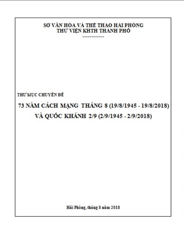 Nhân kỷ niệm 73 năm Cách mạng Tháng Tám (19/8/1945 – 19/8/2018) và Quốc khánh 2/9, Thư viện KHTH Hải Phòng trưng bày, sách, báo với chủ đề "Cách mạng Tháng Tám 1945 - Mốc son chói lọi trong dòng chảy lịch sử". Nhằm tuyên truyền, giới thiệu sâu rộng đến cán bộ, đảng viên và các tầng lớp nhân dân về vai trò, vị trí, giá trị lịch sử to lớn của Cách mạng tháng Tám và sự ra đời của nước Việt Nam Dân chủ Cộng hòa (nay là Cộng hòa xã hội chủ nghĩa Việt Nam) trong lịch sử đấu tranh dựng nước, giữ nước của dân tộc; ý nghĩa, giá trị lịch sử và bài học kinh nghiệm của phong trào Xô viết Nghệ Tĩnh đối với sự nghiệp cách mạng Việt Nam; khẳng định sự lãnh đạo đúng đắn và sáng suốt của Đảng Cộng sản Việt Nam, Chủ tịch Hồ Chí Minh đối với sự nghiệp giải phóng dân tộc, xây dựng và bảo vệ Tổ quốc.. Bên cạnh đó, giáo dục lòng yêu nước, truyền thống lịch sử, văn hóa dân tộc; bồi dưỡng và phát huy chủ nghĩa anh hùng cách mạng, tinh thần đại đoàn kết, niềm tự hào và ý chí tự lực, tự cường dân tộc; góp phần củng cố và bồi đắp niềm tin của nhân dân đối với Đảng, Nhà nước và chế độ.